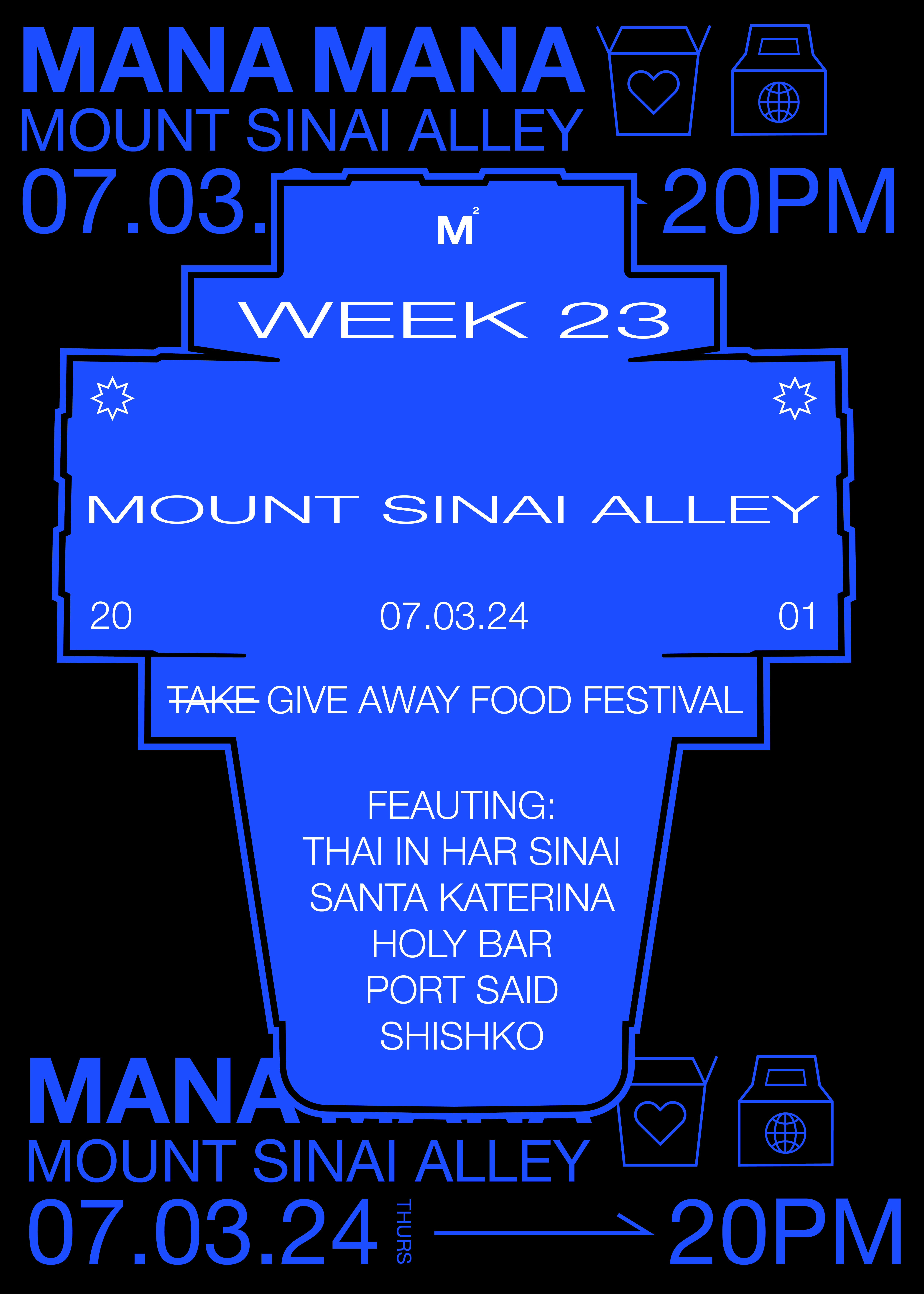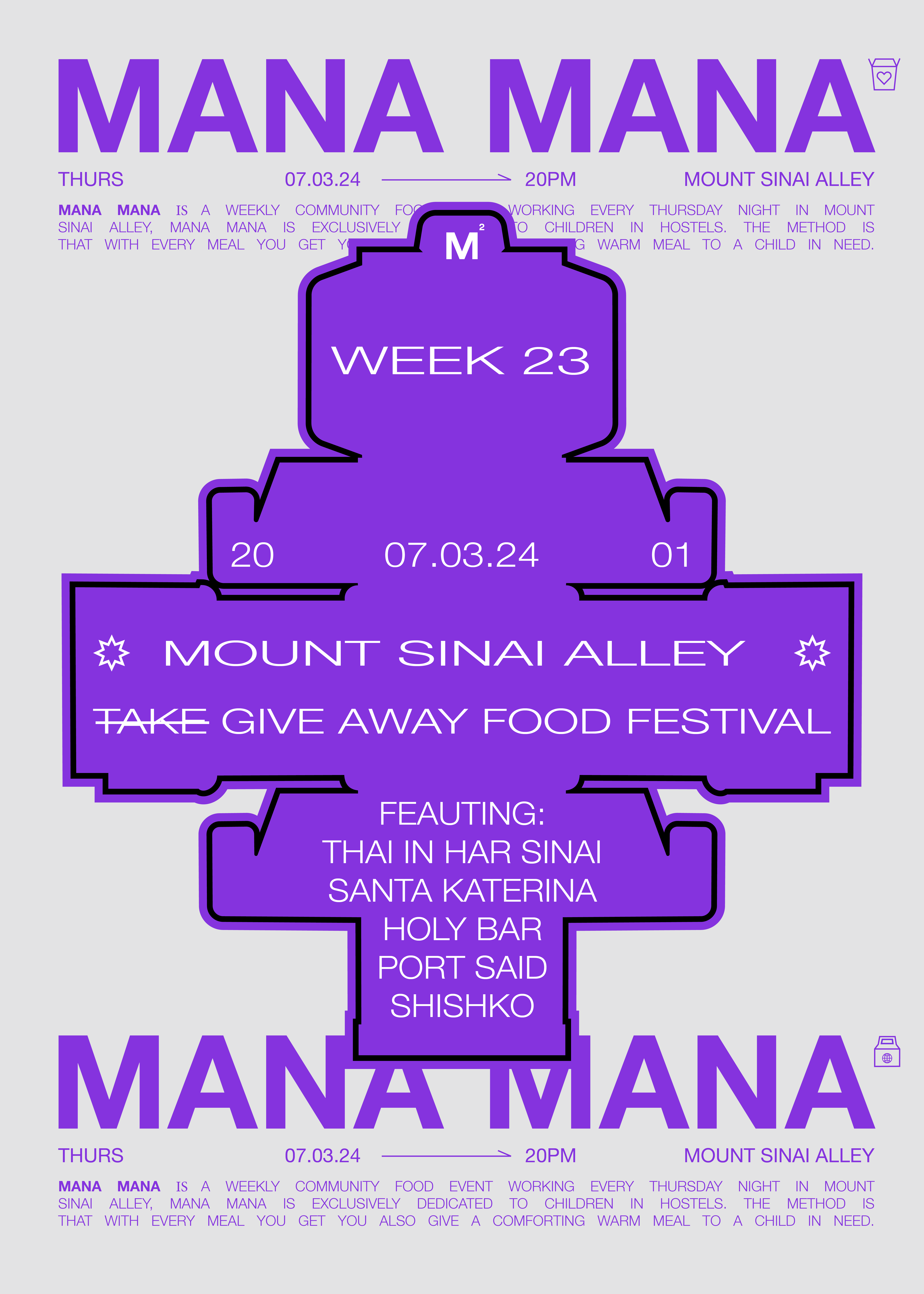MANA MANA is a branding for a community food festival happening in Har Sinai alley. The festival operates on a one-for-one model - for every dish you take, you also give a comforting warm meal for a child in need. I took my inspertion from the layout of the take away boxes and made them the layout of my typography and the colors from the Tel-Avivien night scene.